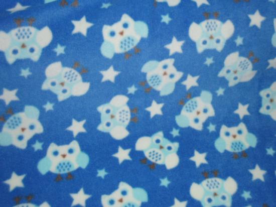 Vaaleansininen antipillingkäsitelty pöllökuvioinen mikrofleece. 100% polyesteri Leveys 170cm