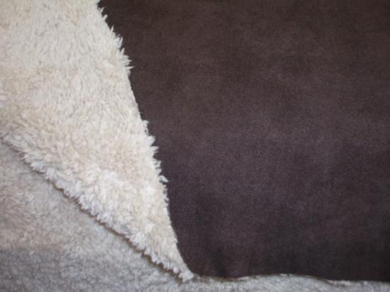 Beige teddykangas, toinen puoli tummanruskeaa "mokkajäljitelmä"kangasta.